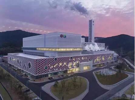寧波市鄞州區生活垃圾焚燒發(fā)電廠坐落于青山綠水之間,深紅色...